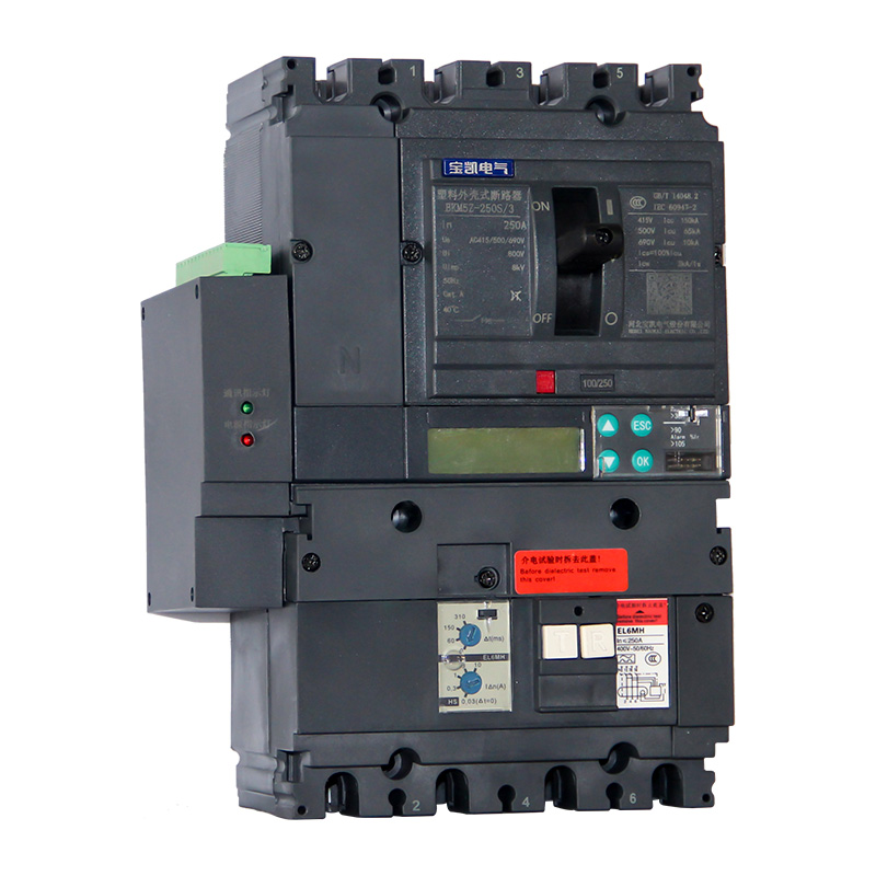 BKM5 系列塑料外壳式断路器适用于交流50Hz,额定绝缘电压1000V,额定工作电压至690V,额定电流12.5A至1600A的配电网络中,用来分配电能和保护线路及电源设备免受过载、短路、欠电压等故障的损坏。亦可作为电动机的不频繁起动及过载、短路、欠电压保护。加装Vigi剩余电流保护模块的断路器,只能上进线。MIC5.0E智能型断路器只能上进线。其他规格的断路器,既可上进线,也可下进线。本系列断路器具有隔离功能。本系列断路器可垂直安装(即竖装),亦可水平安装( 即横装)。本系列断路器执行标准:IEC 60947-1及GB/T 14048.1 《低压开关设备和控制设备 第1部分:总则》IEC 60947-2及GB/T 14048.2 《低压开关设备和控制设备 第2部分:断路器》IEC 60947-4及GB/T 14048.4 《低压开关设备和控制设备 第4-1部分:接触器和电动机起动器 机电式接触器和电动机起动器(含电动机保护器)》GB/T 22710《低压断路器用电子式控制器》